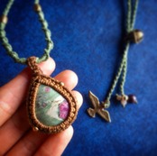 Ruby in Fuchsite, Brass Beads, Garnet, Pinkmoonstone, Wax Cord