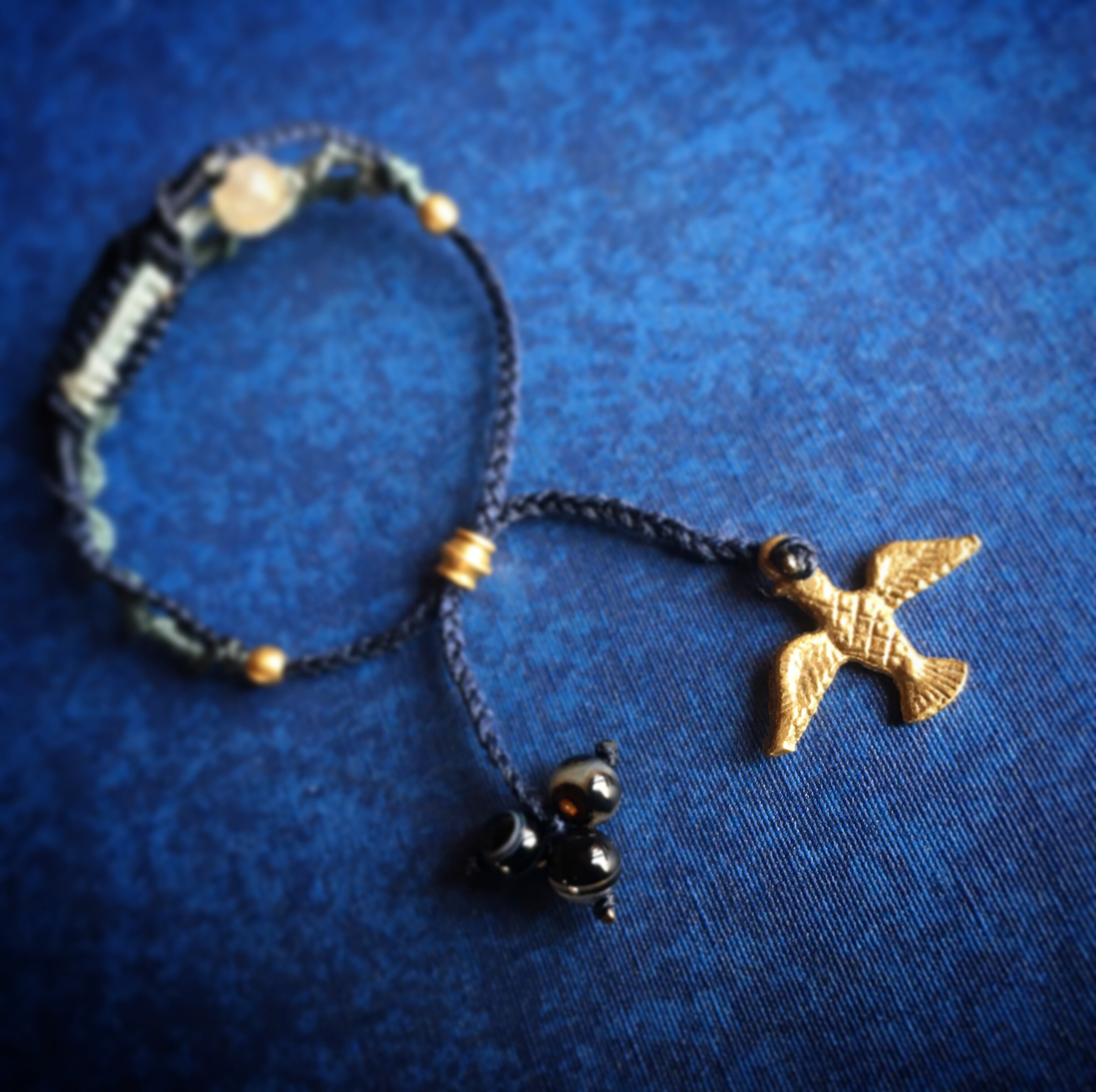 エンド部分は真鍮の鳥のビーズ、マーブル模様の美しいブラックオニキスで仕上げています