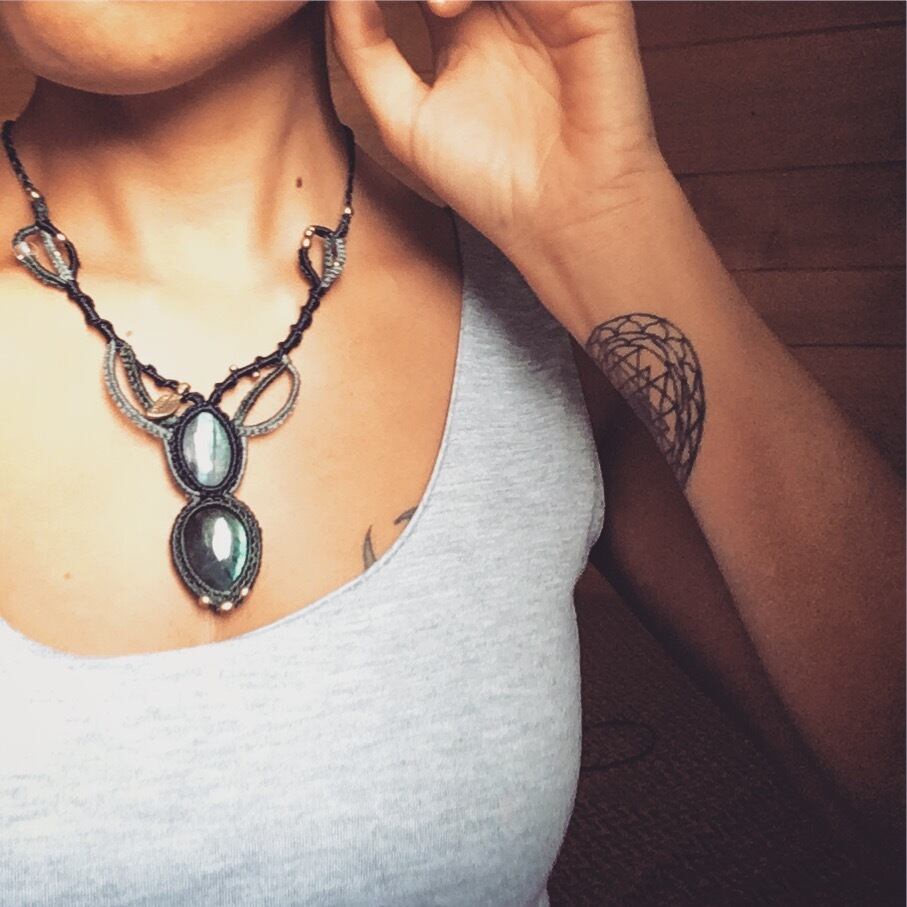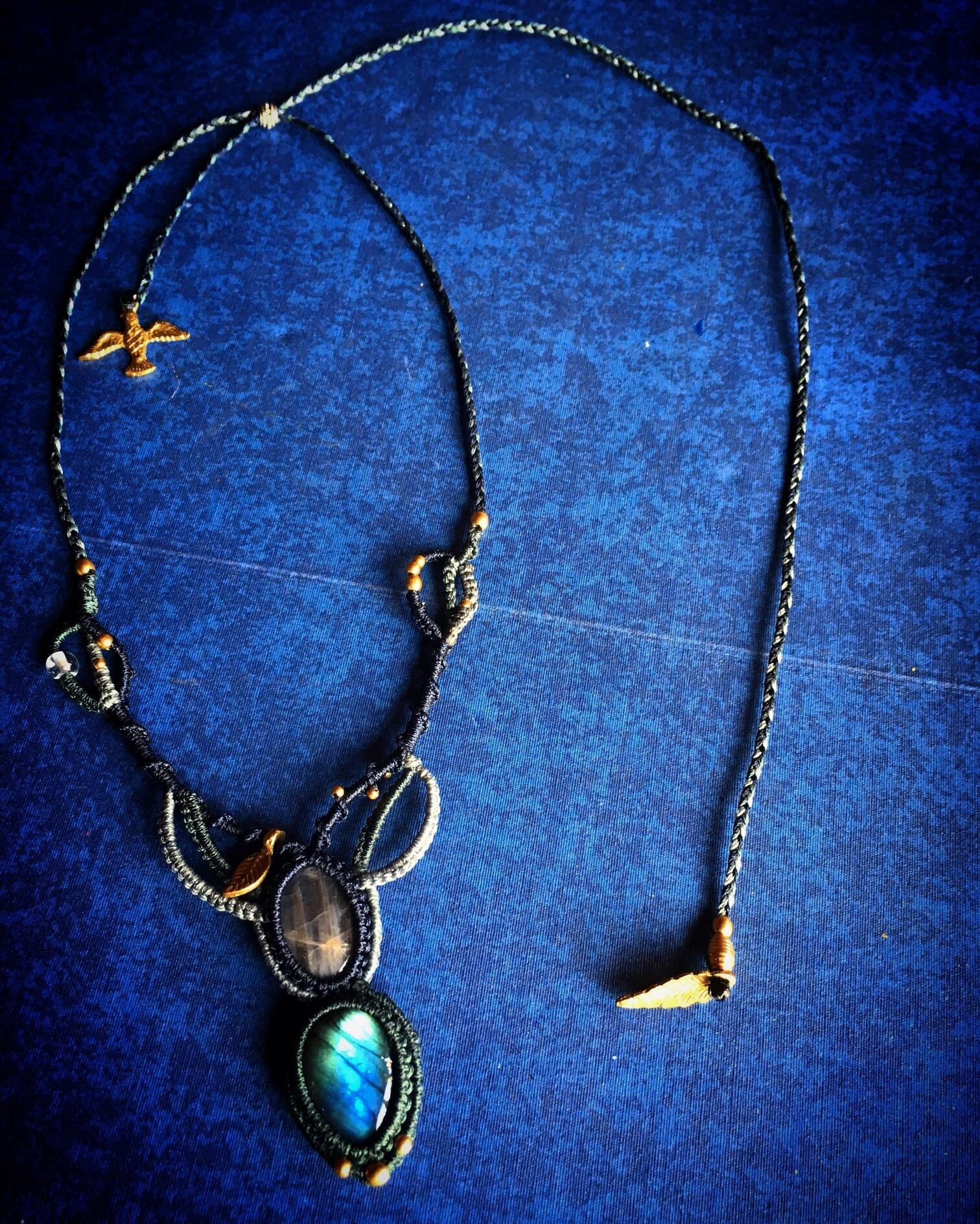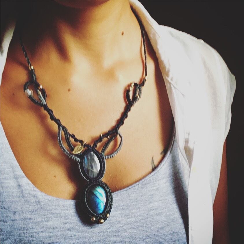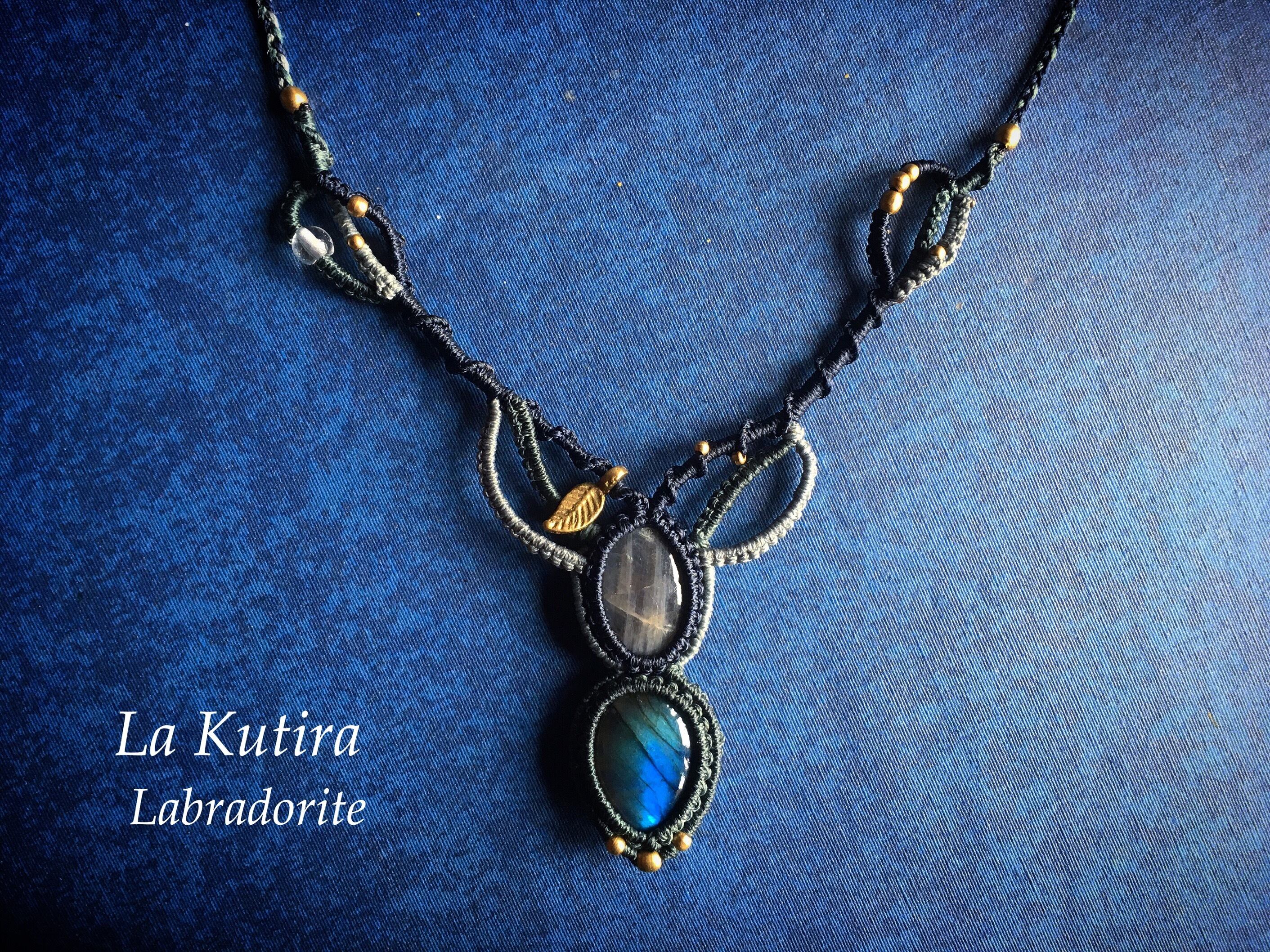 ふたつのラブラドライトを組み合わせています 上は淡い水色が奥の方にのぞく静かなエネルギーの石、下はちっくりと艶やかに青色〜水色のグラデーションが輝き、まるで青い炎、情熱のような石です