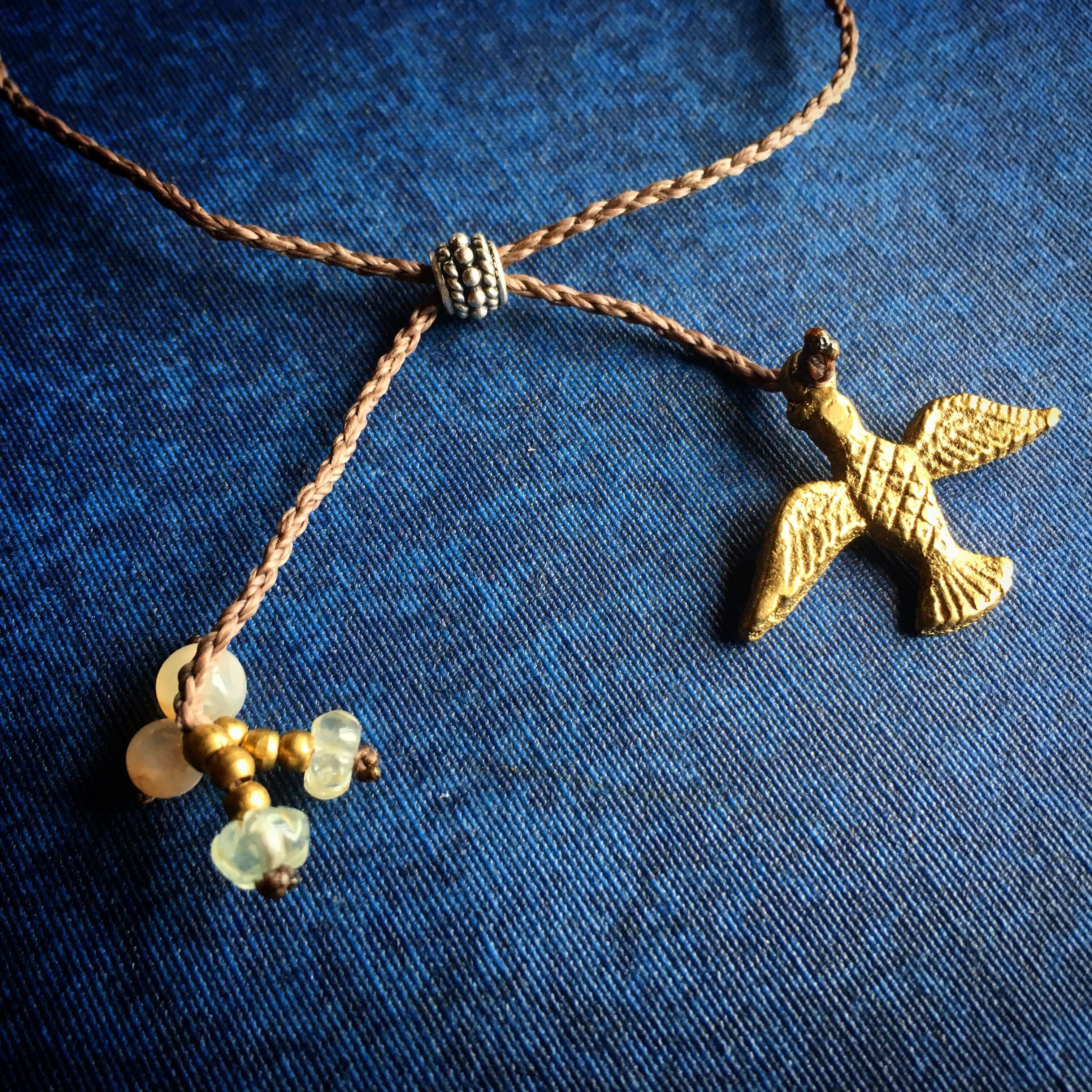 エンド部分は真鍮の鳥と、アクアマリンとムーンストーンのビーズで仕上げています。石の隣にはシルバービーズを配置しています。