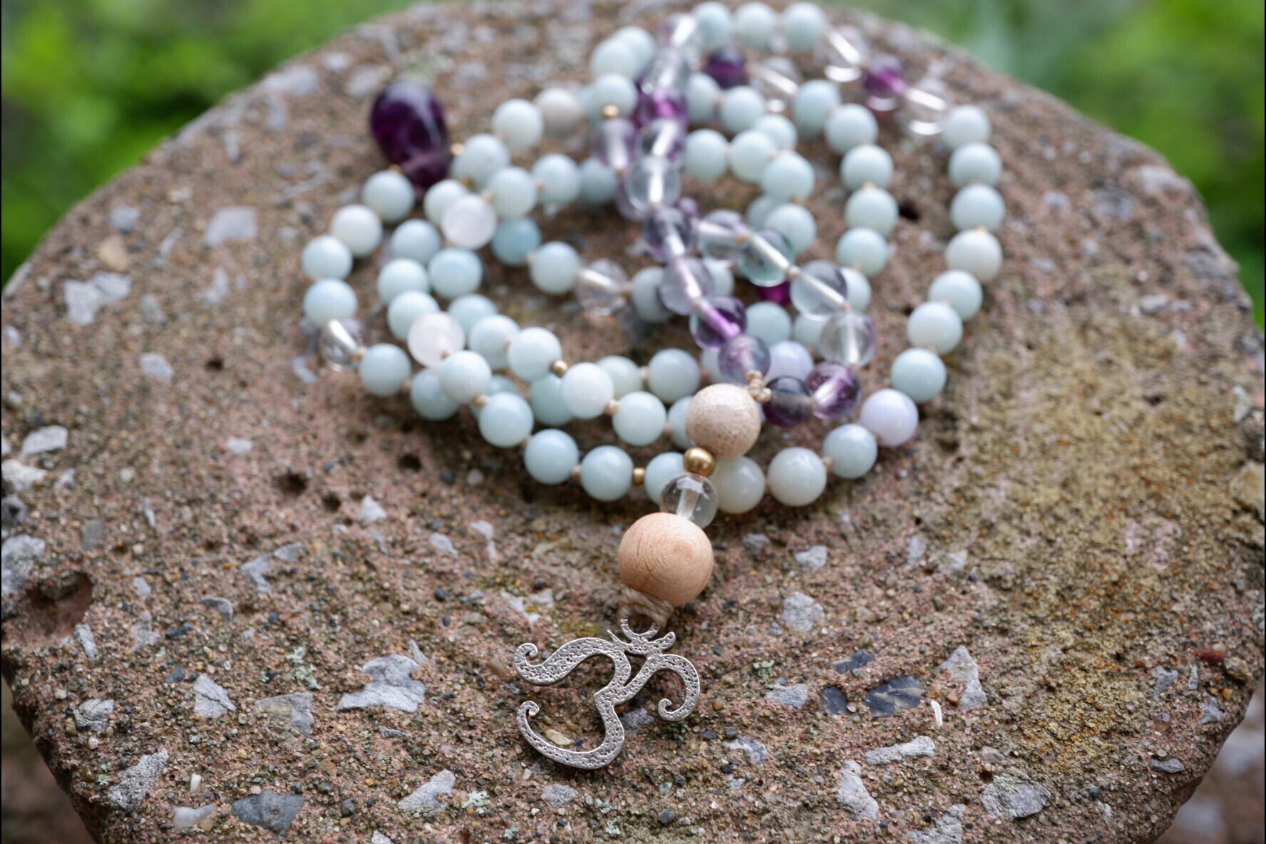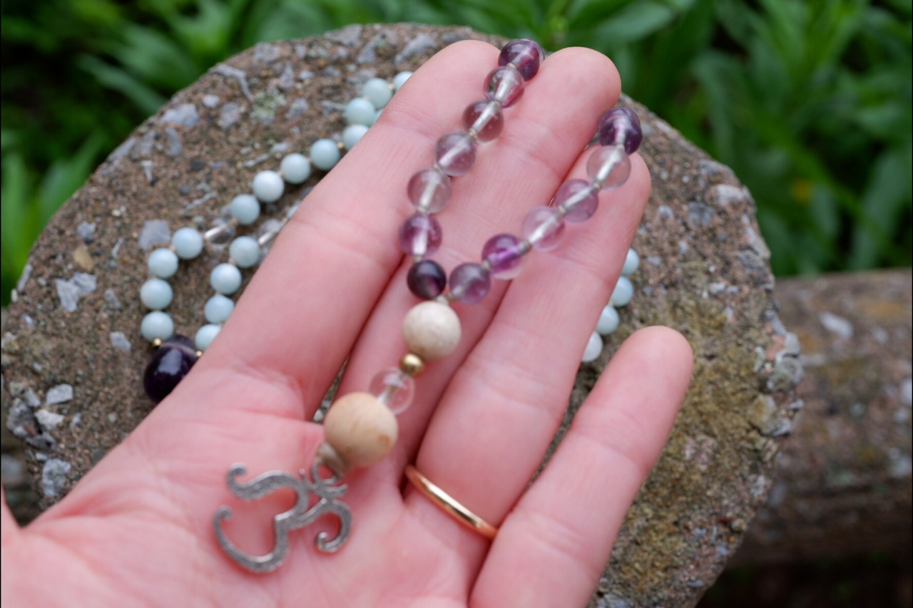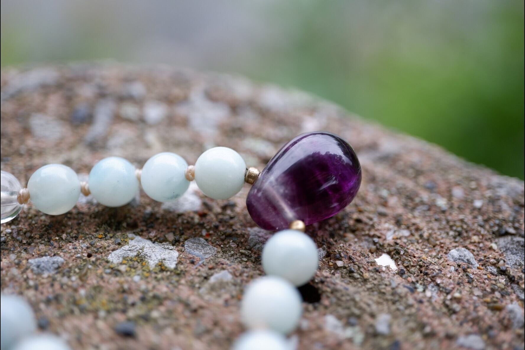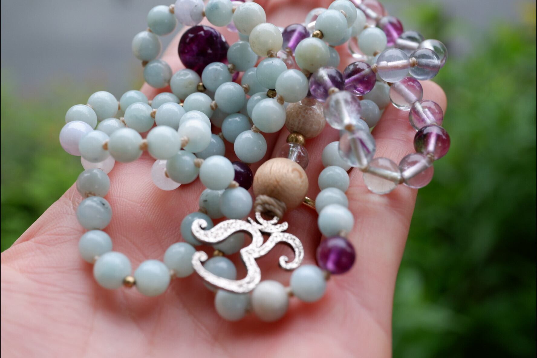 トップには美しく力強いオームをかたどったSilver 925のチャームを。柔らかくて素直なエネルギーのアマゾナイトと、透明感が美しいレインボーフローライトを繋ぎました。