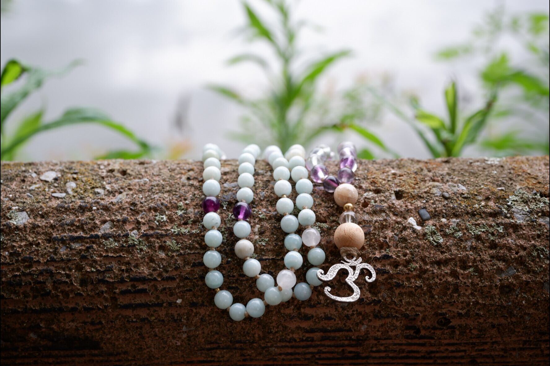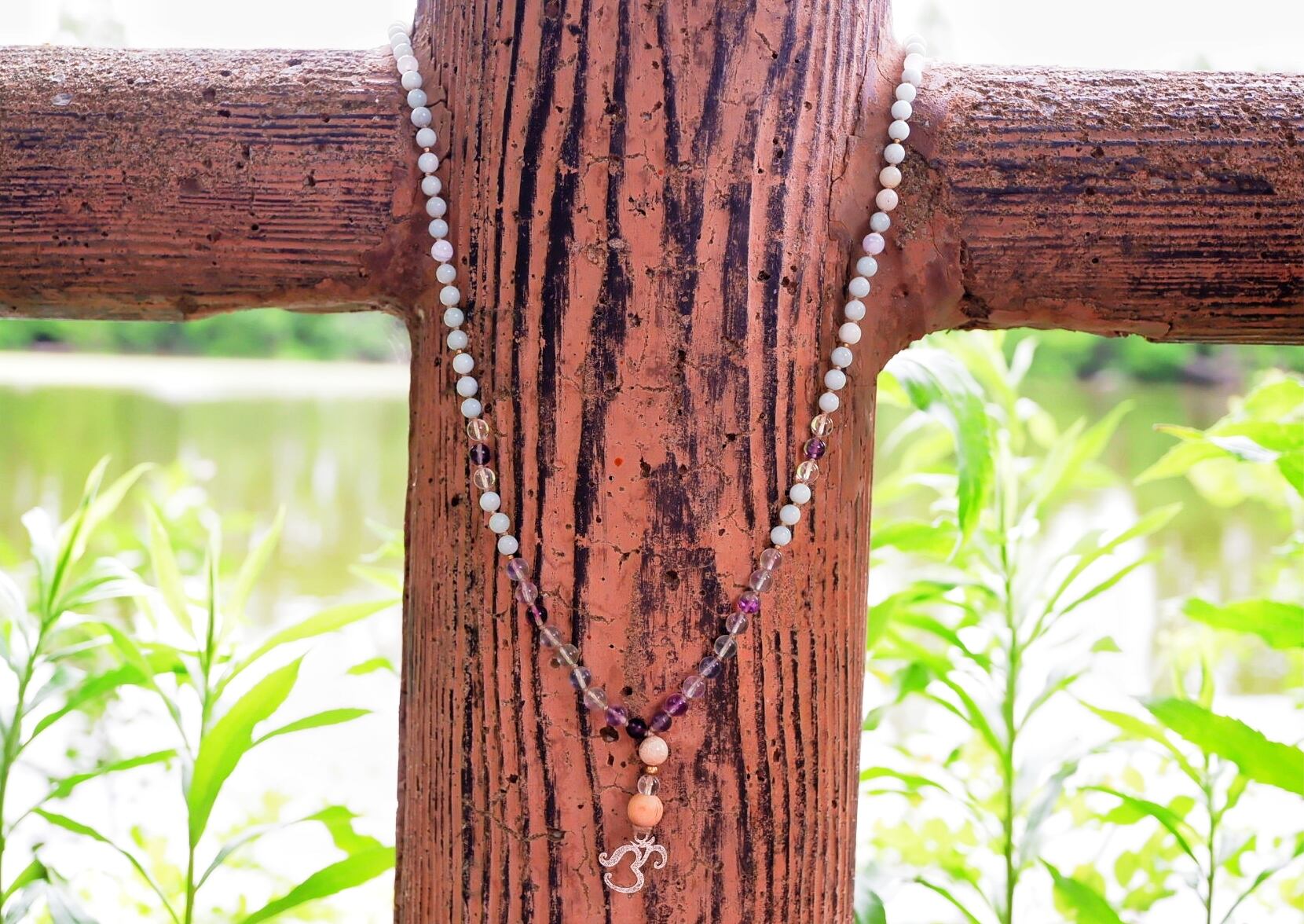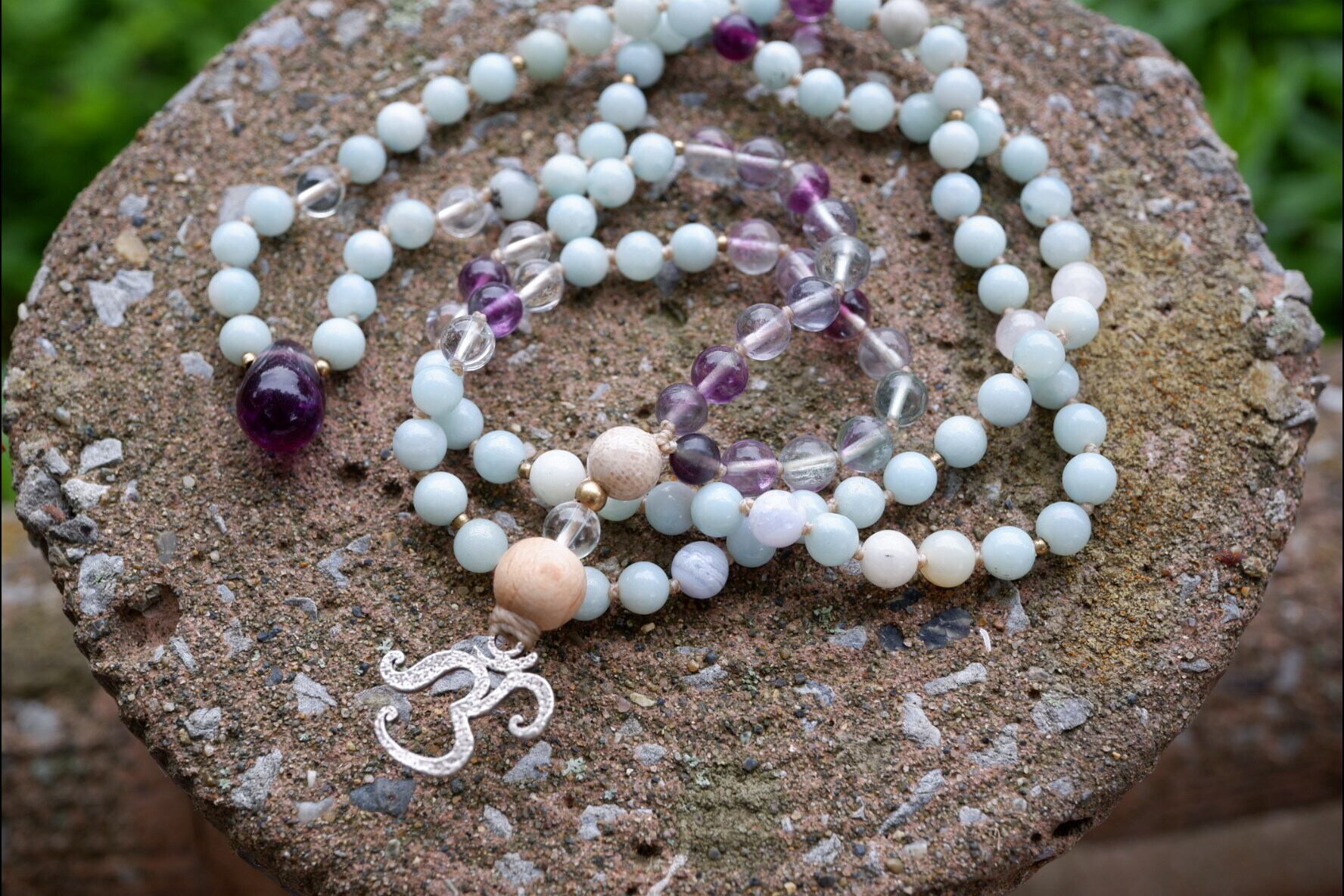 トップには美しく力強いオームをかたどったSilver 925のチャームを。柔らかくて素直なエネルギーのアマゾナイトと、透明感が美しいレインボーフローライトを繋ぎました。