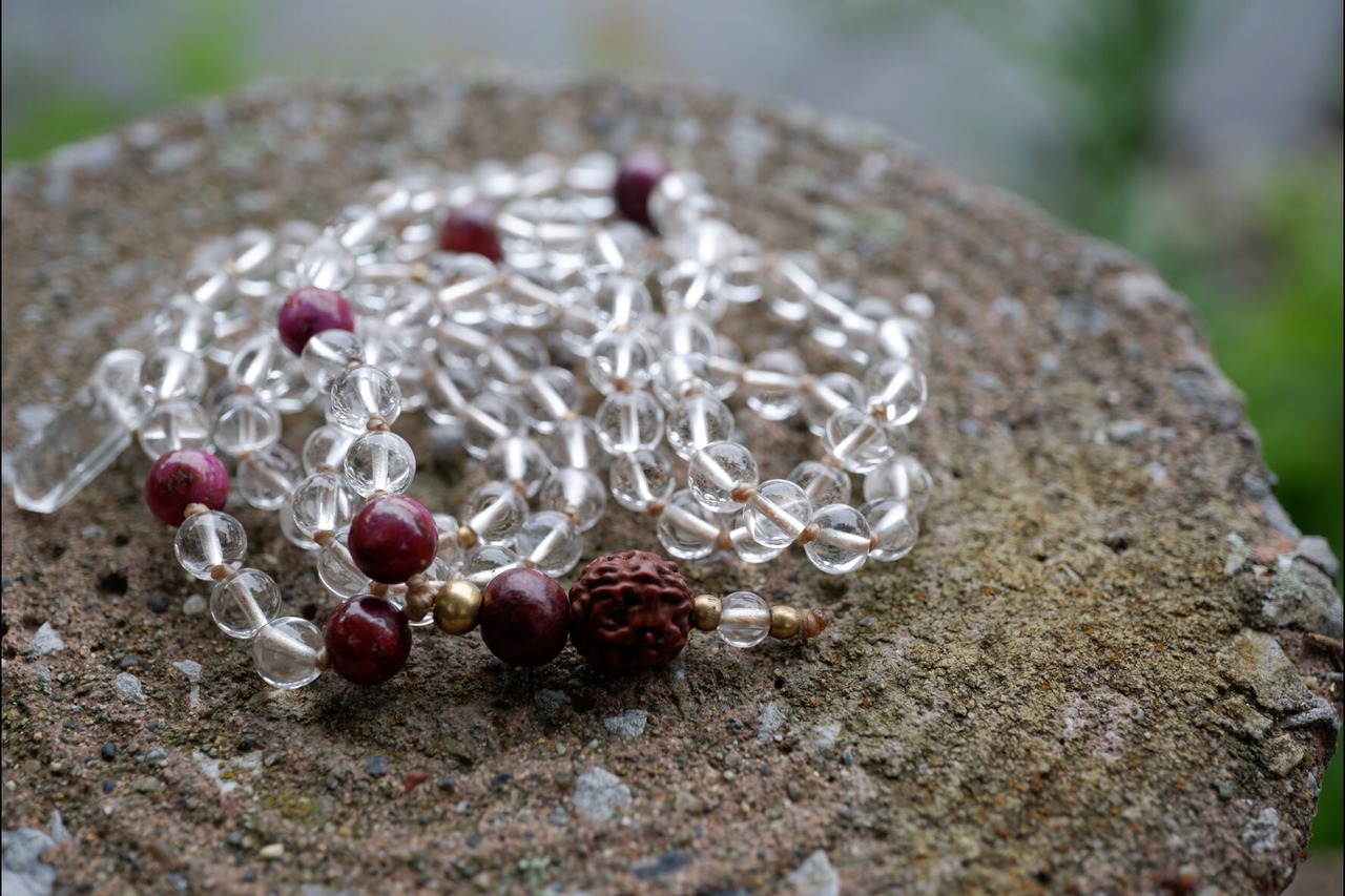 高価で希少なルビーのビーズをポイントに使い、サンダルウッドとルドラクシャをトップのグルビーズに選びました。