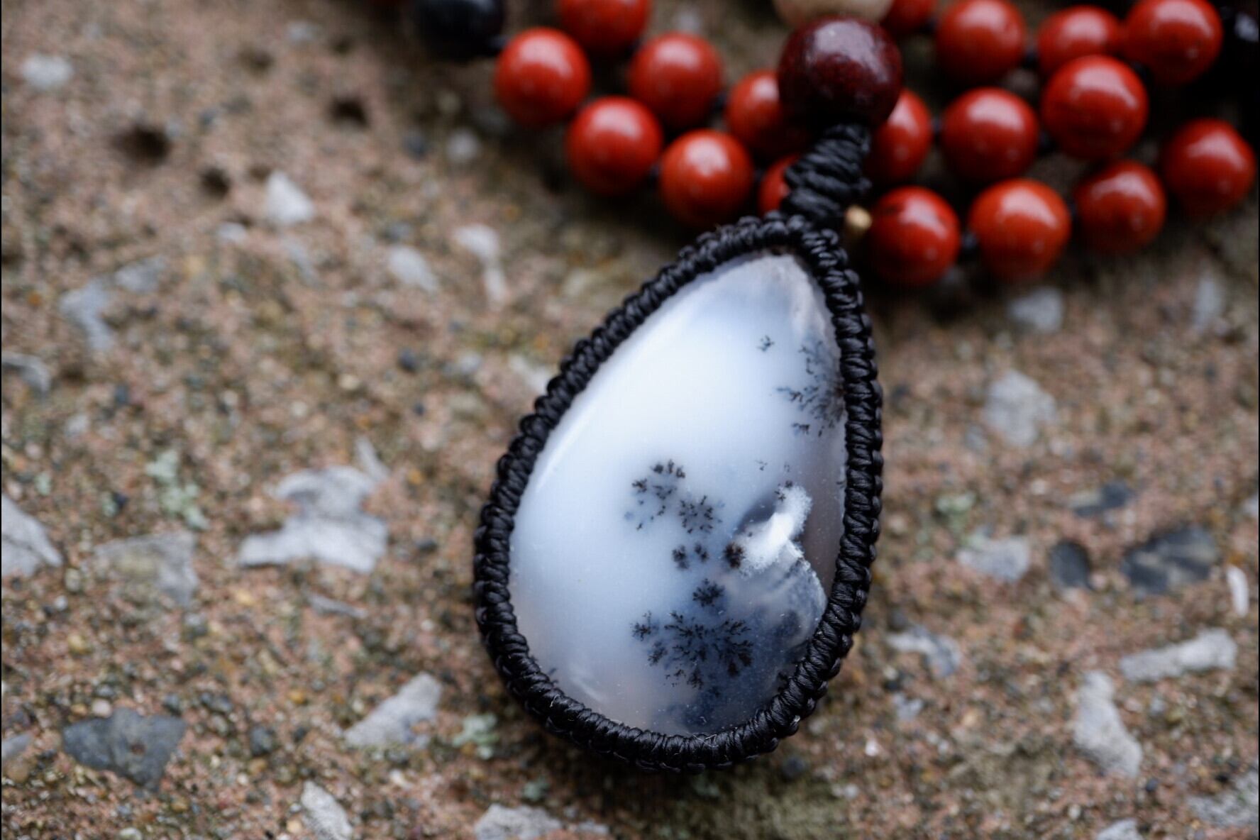 トップには雪景色の中に植物を閉じ込めた絵画のような美しさをもつデンドリティックアゲート。
