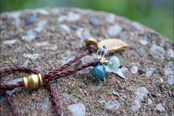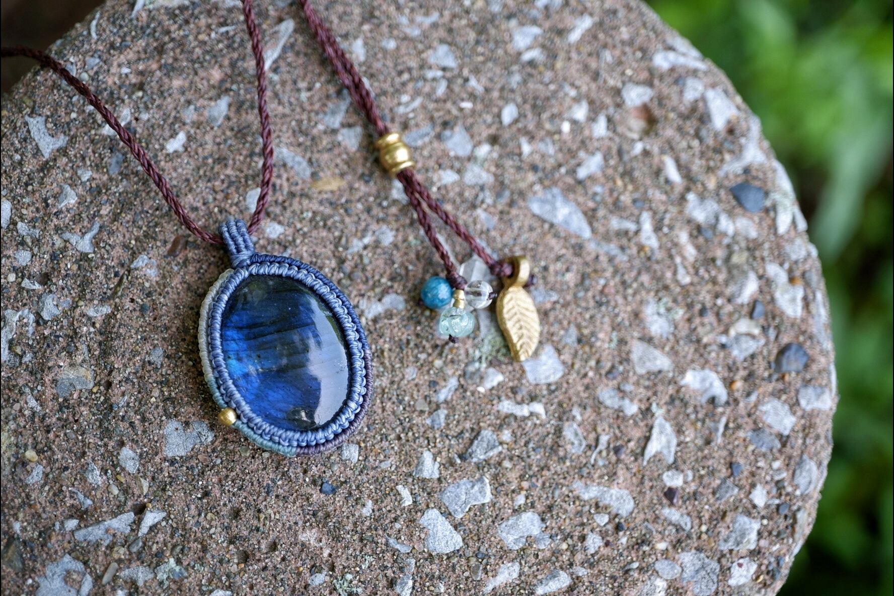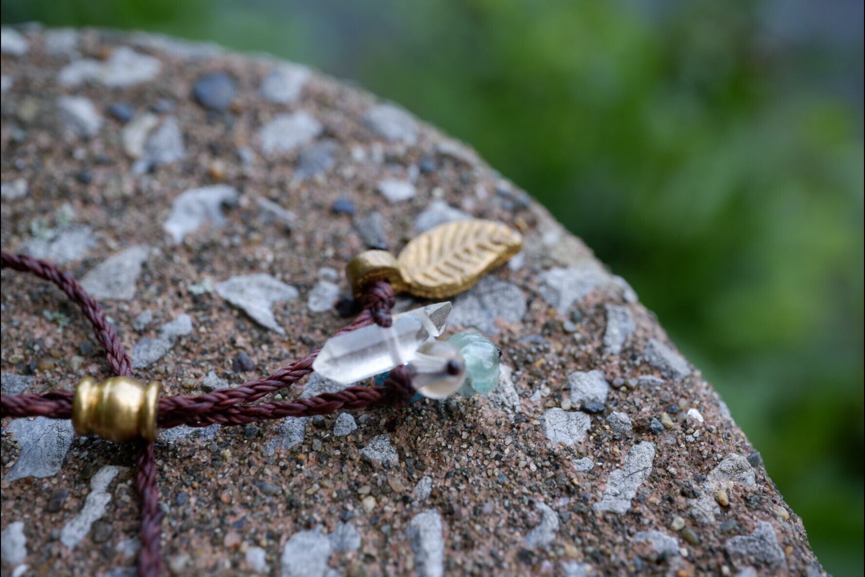 シンプルなデザインで、石周りはブルーの糸で編み、4色の糸で装飾を施し、紐はブラウンの糸で編んでおり、いろいろなお洋服にも合わせやすく毎日一緒にいられるようなネックレスです。背守りにはかわいい葉っぱの真鍮チャームと、小さな水晶、アクアマリン、水晶ナチュラルポイント、アパタイトビーズを使用しており、後ろ姿もかわいいです。