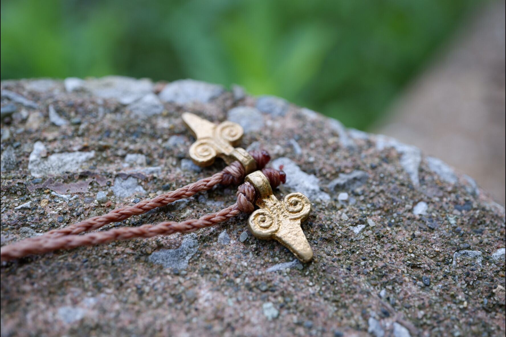 シンプルなデザインで、石周りはライトブラウンの糸で編みダークブルーの糸で装飾を施し、紐はライトブラウンの糸で編んでおり、いろいろなお洋服にも合わせやすく毎日一緒にいられるようなネックレスです。背守りにはインドの真鍮チャームを使用しており、後ろ姿もかわいいです。