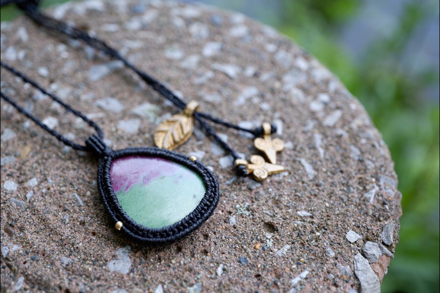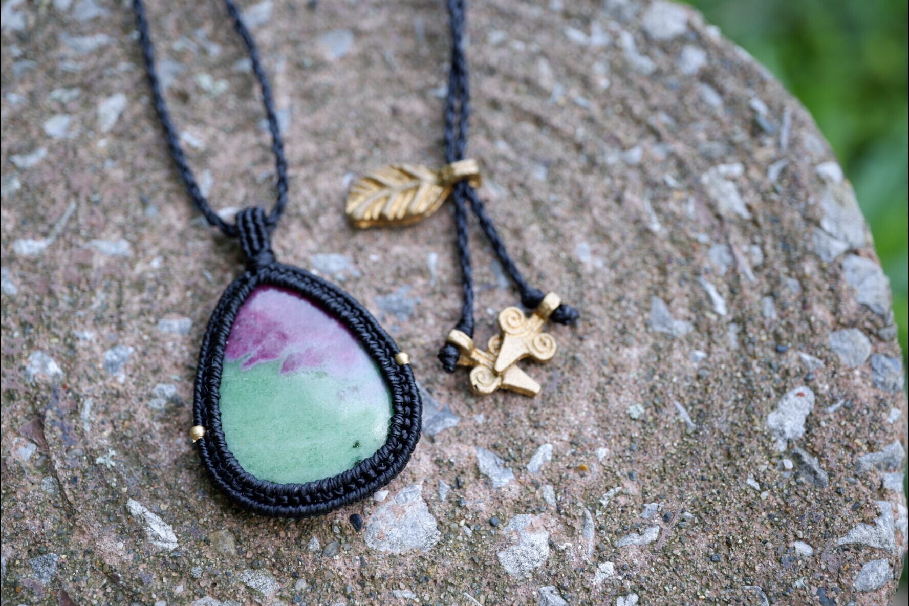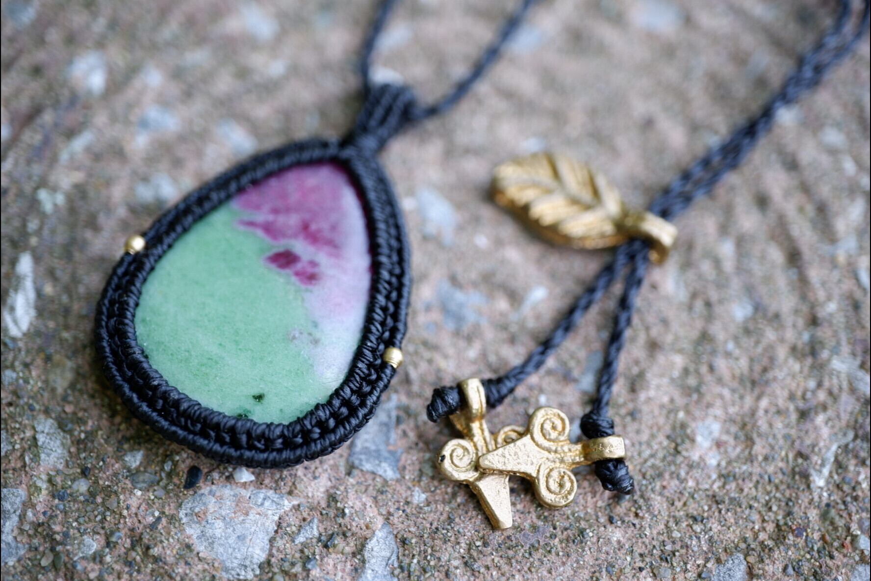 毎日身につけられるように、シンプルなデザインで丁寧に編みあげたドロップ型のルビー・イン・ゾイサイトのネックレス。
