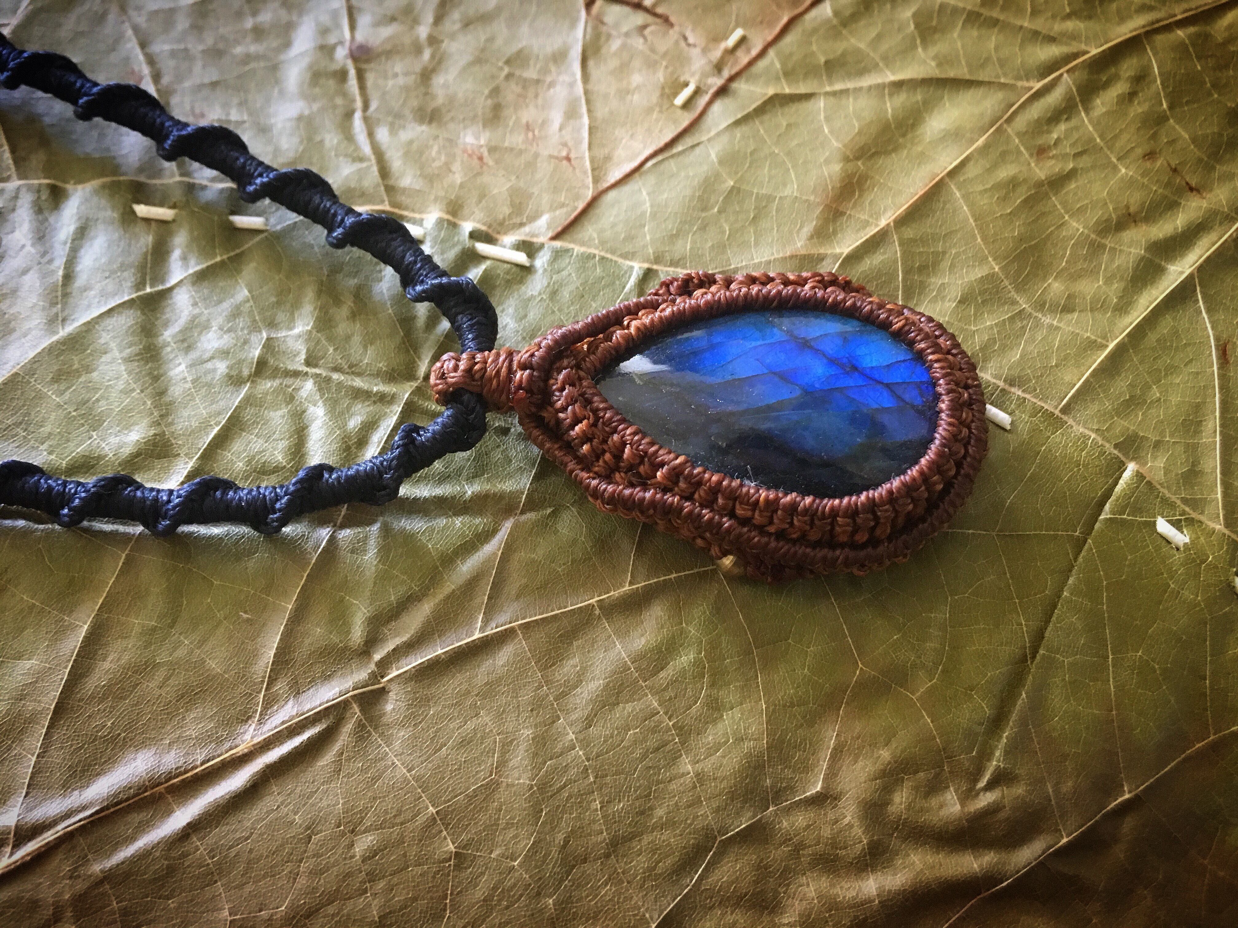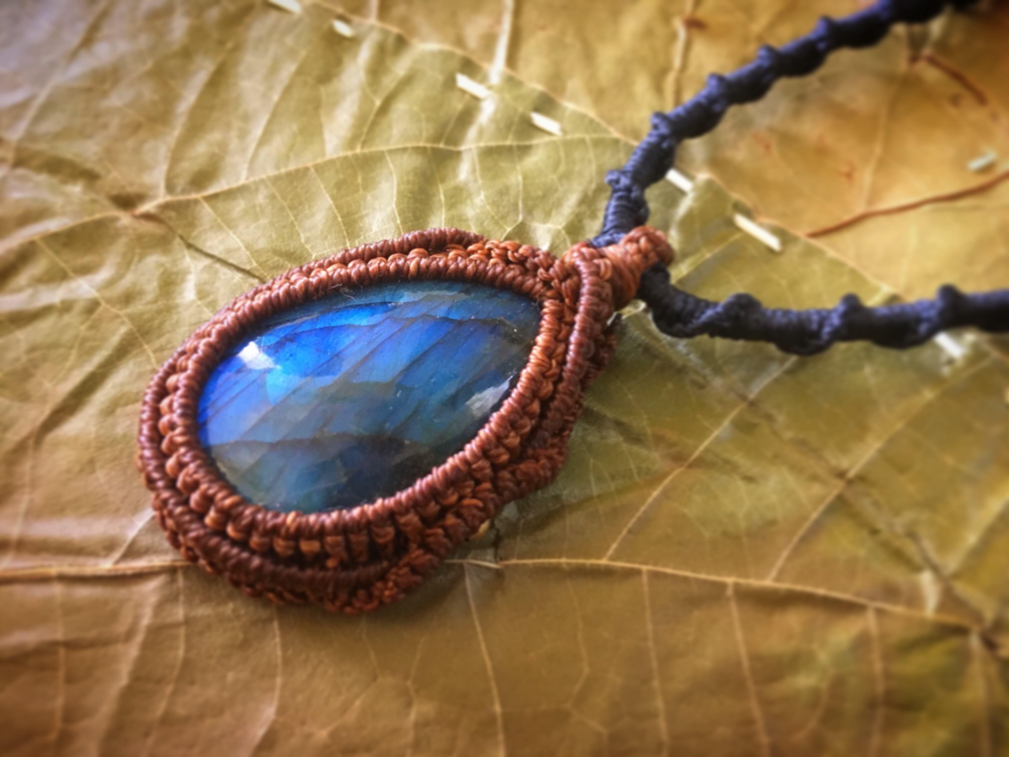 ドロップ型のラブラドライトをシンプルな配色で丁寧に編み上げました。