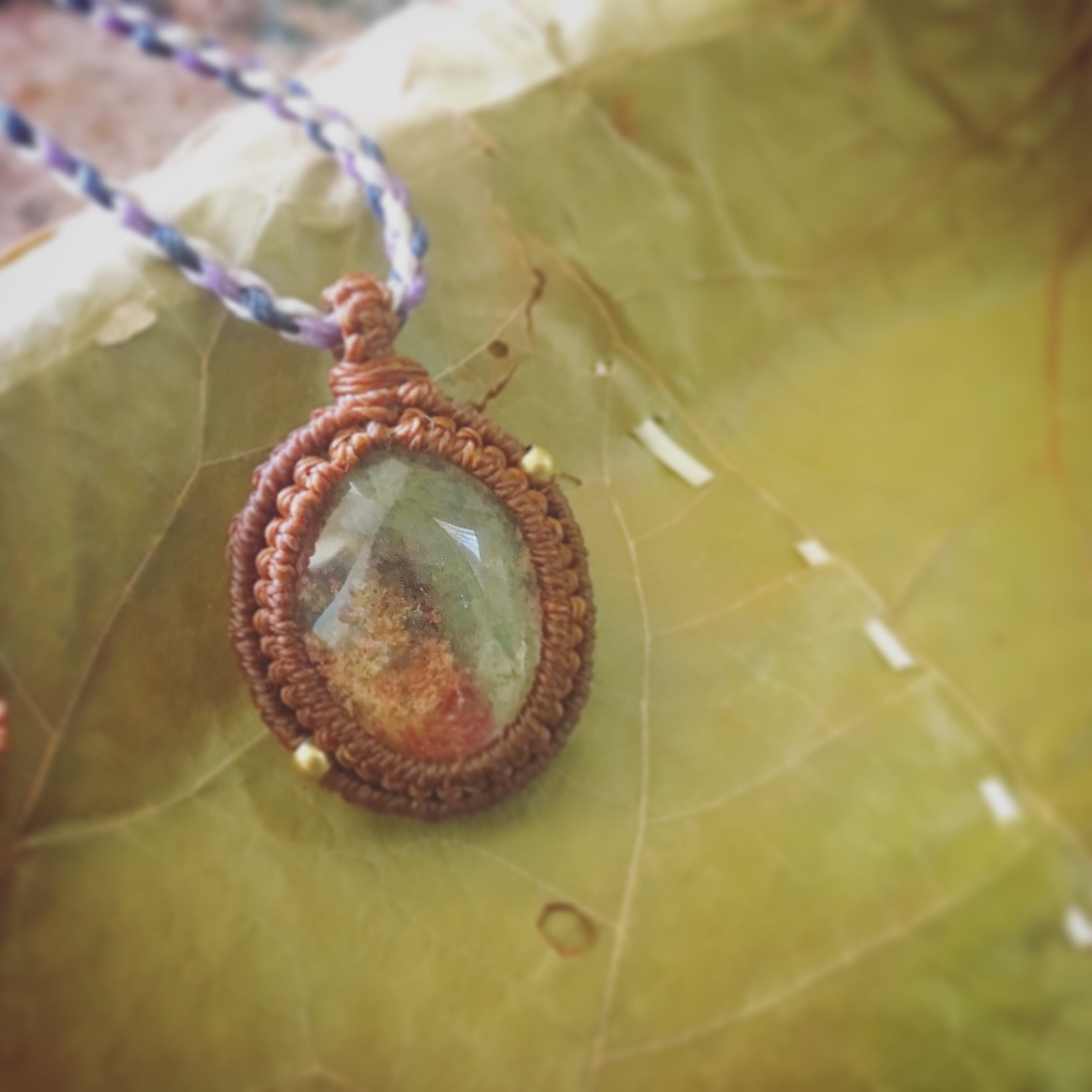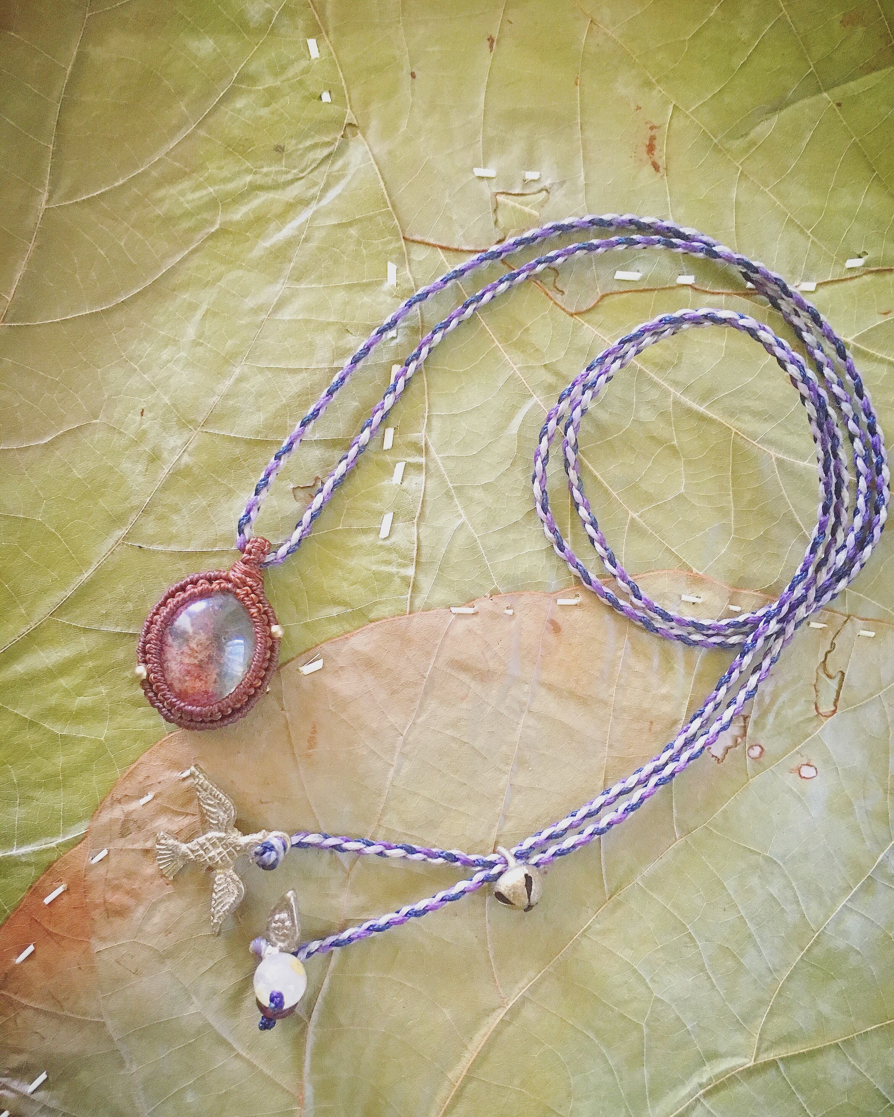 エンド部分には真鍮の鳥と葉っぱ、ガーネットと、ガーデンクォーツととても相性の良いルチルクォーツの大粒ビーズで仕上げています。