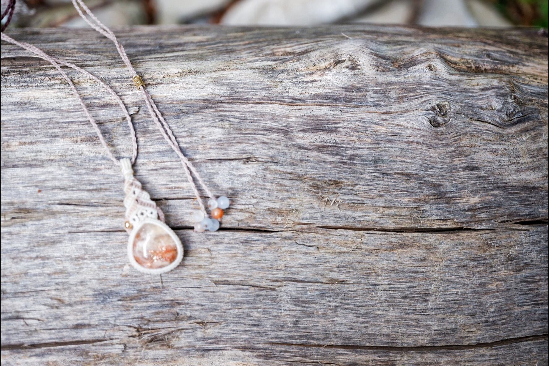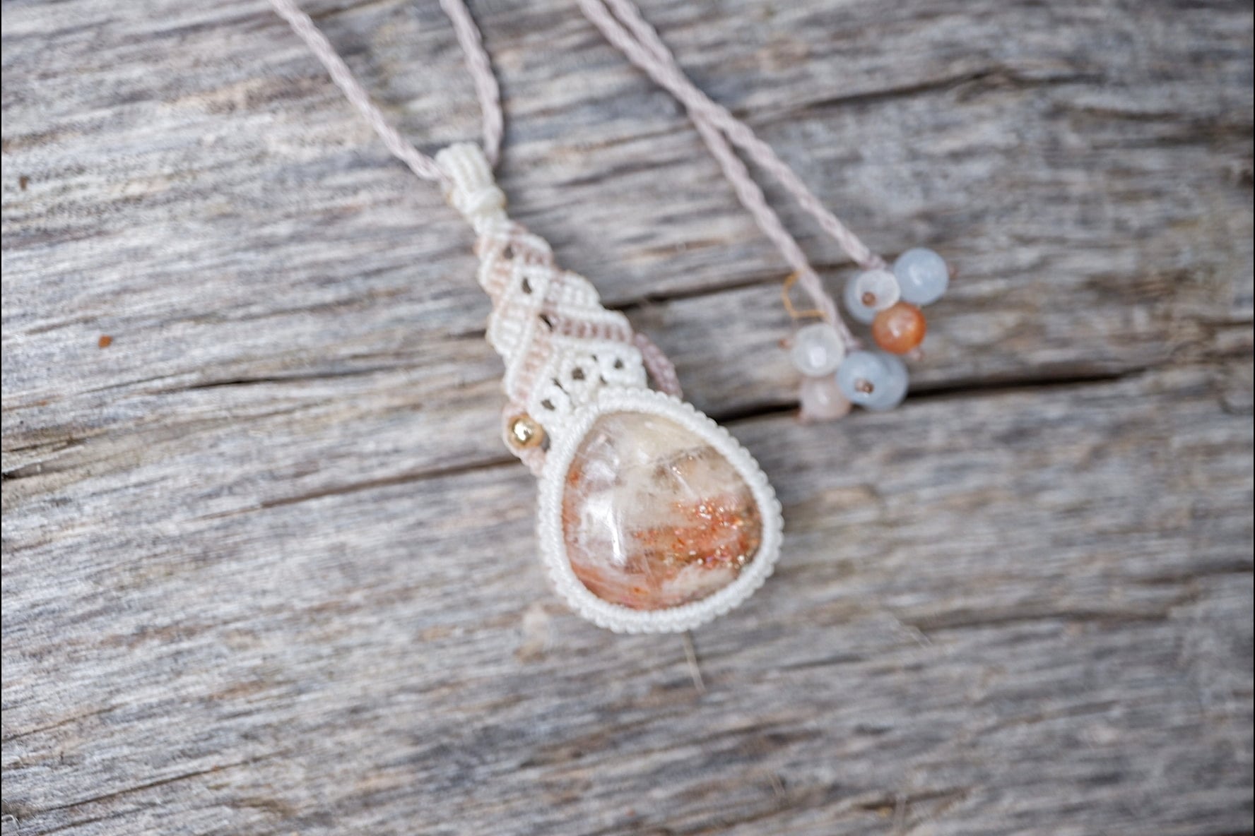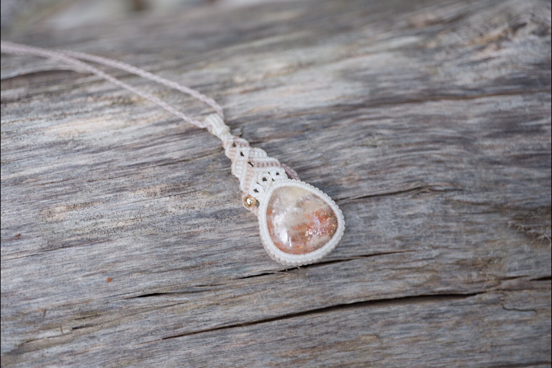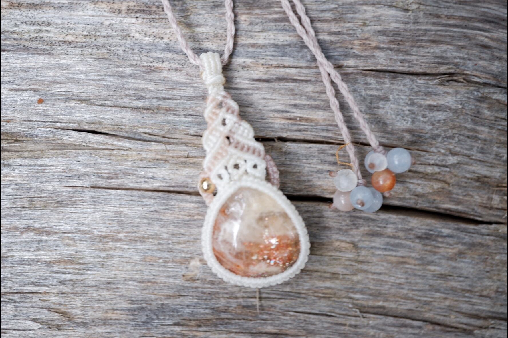 石周りはホワイト、装飾にベージュ&ピンクベージュの糸、紐部分は生成りの糸で編んでいます。
