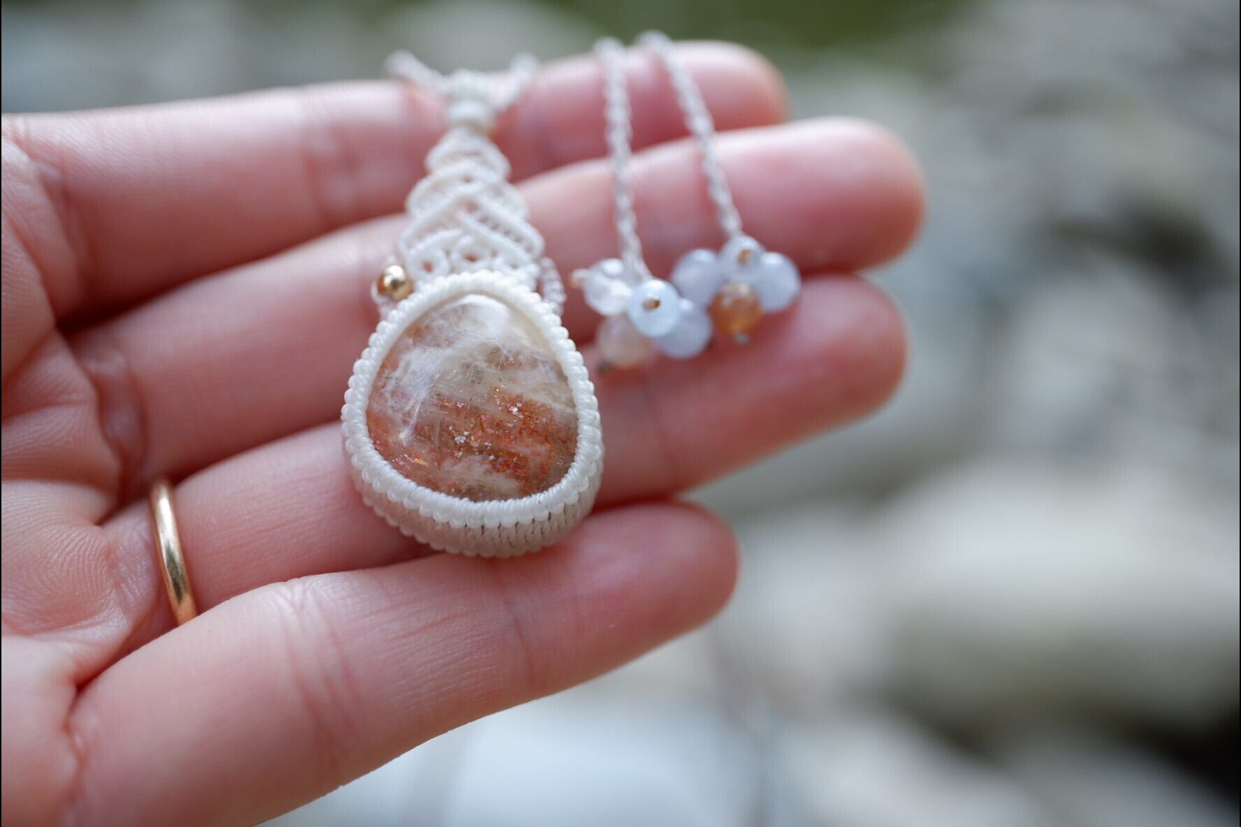 背守り部分には小さな天然石ビーズ(サンストーン、アクアマリン、ムーンストーン)のビーズを配置しています。