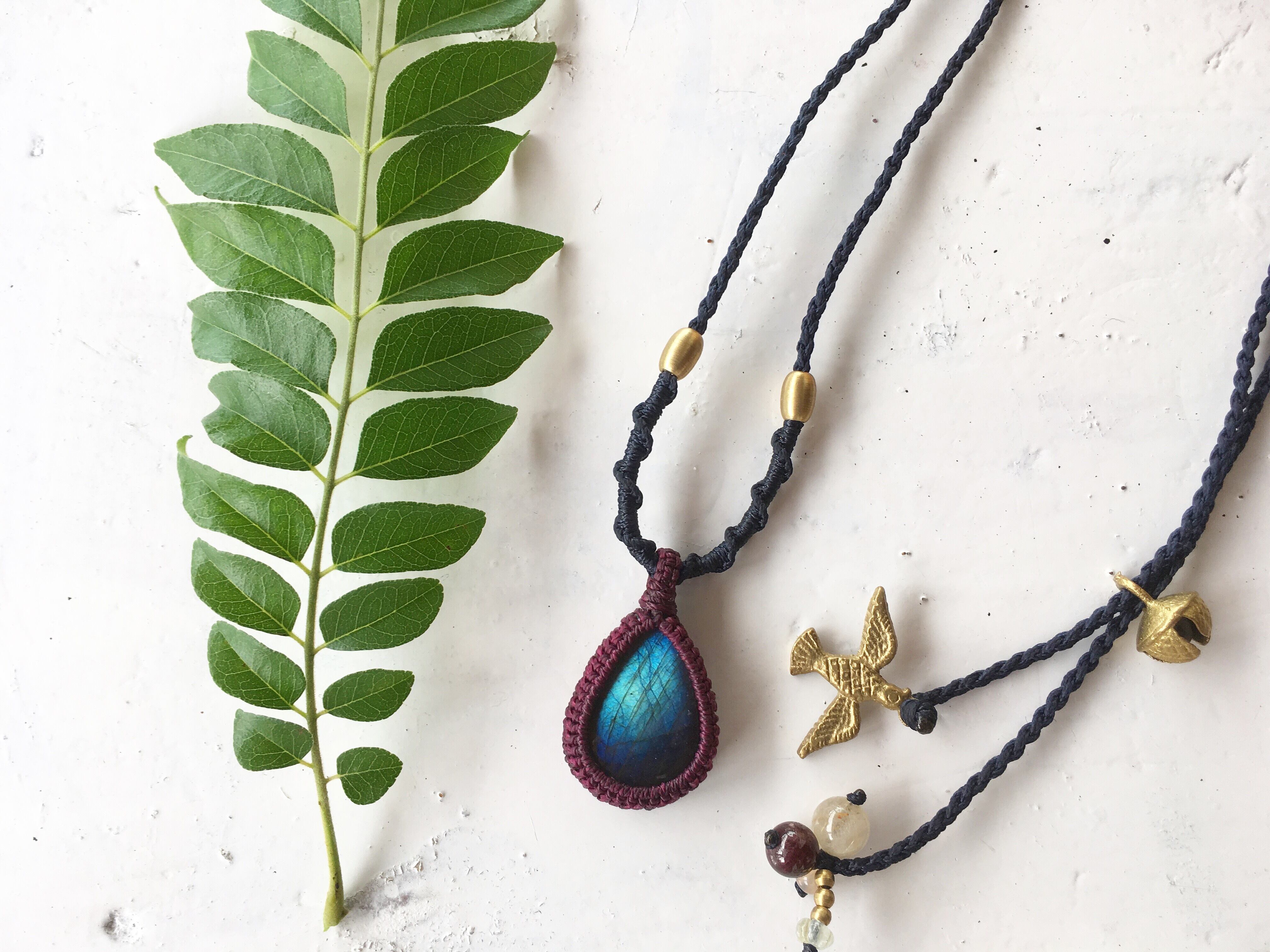 エンド部分には真鍮の鳥、ルチルクォーツ、ガーネット、オレンジムーンストーン、アクアマリンのビーズを配置しました。