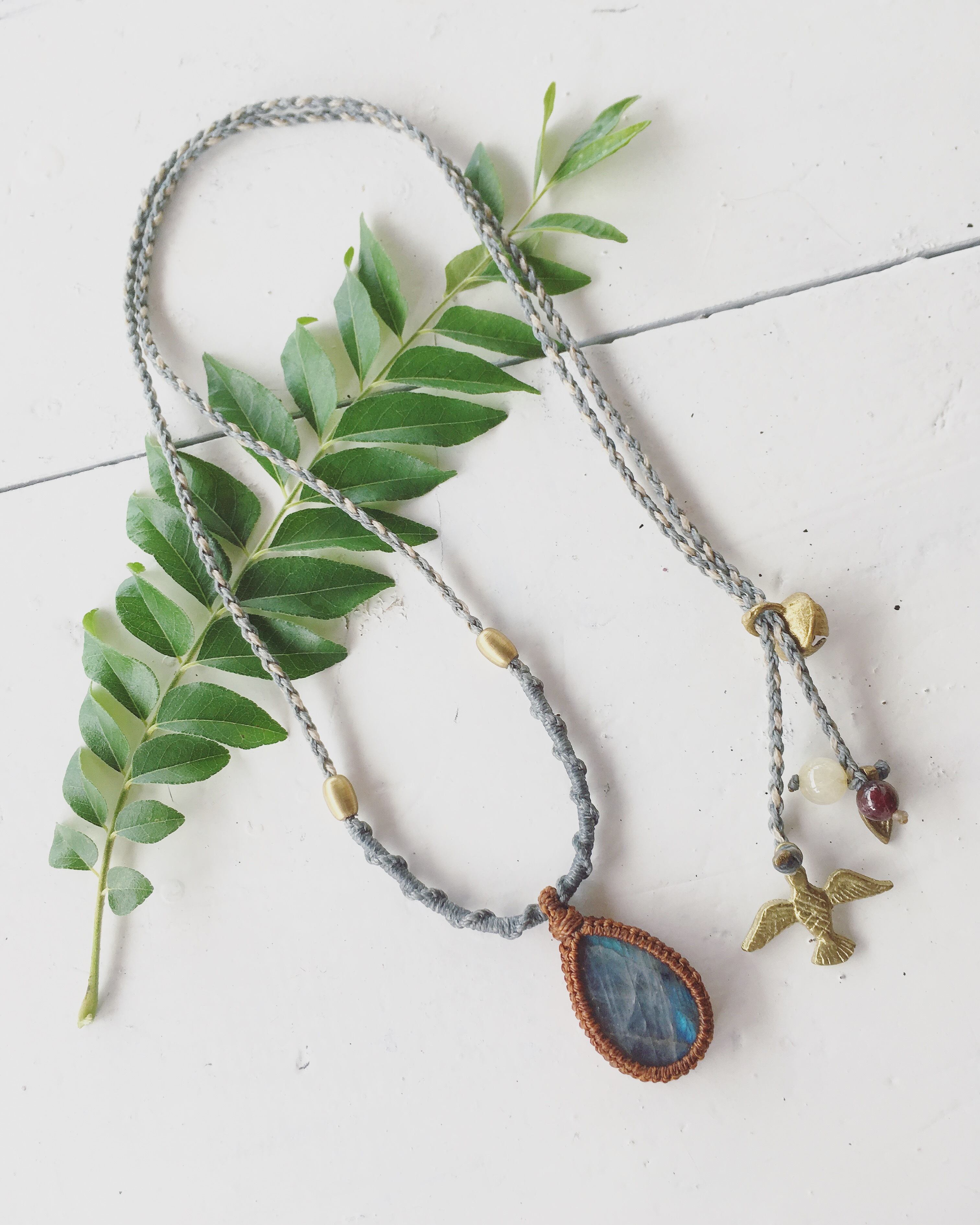 エンドの部分には真鍮の鳥と葉っぱ、ルチルクォーツ、ガーネットの天然石ビーズで仕上げています。