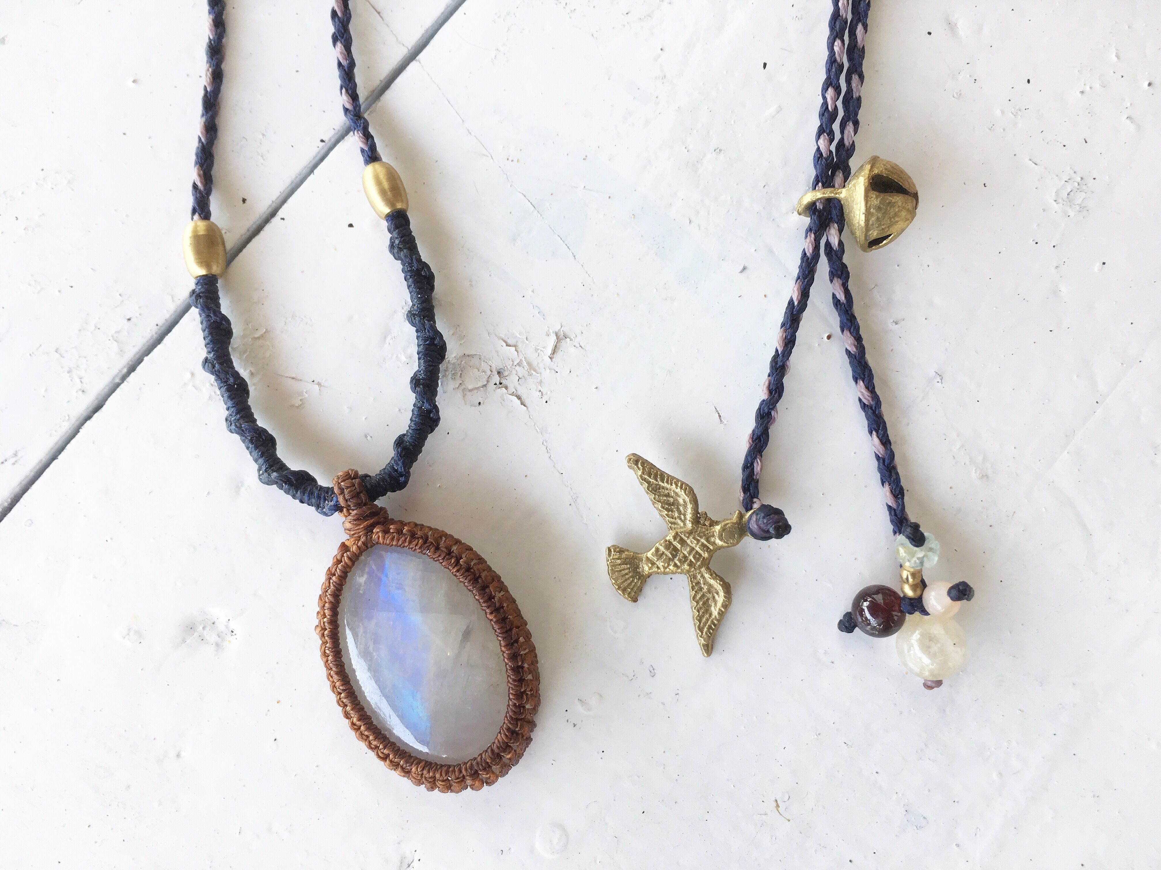 エンド部分は真鍮の鳥、ユナカイト、ムーンストーン、オレンジムーンストーン、モスアゲートの天然石ビーズで仕上げています。